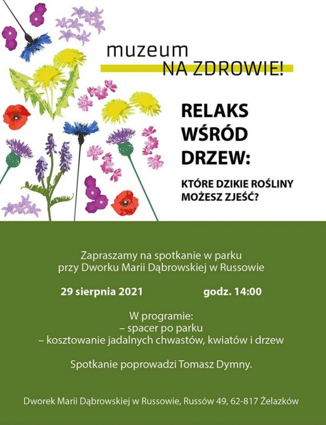 Muzeum Okręgowe Ziemi Kaliskiej zaprasza na kolejne wydarzenie z cyklu „Relaks wśród drzew".Tym razem będzie to nietypowy spacer podczas którego uczestnicy skosztują chwastów, kwiatów oraz liści drzew. Organizatorzy przygotowali też pogadankę na temat dzikich roślin jadalnych, których walory smakowe i odżywcze są dziś niedoceniane.