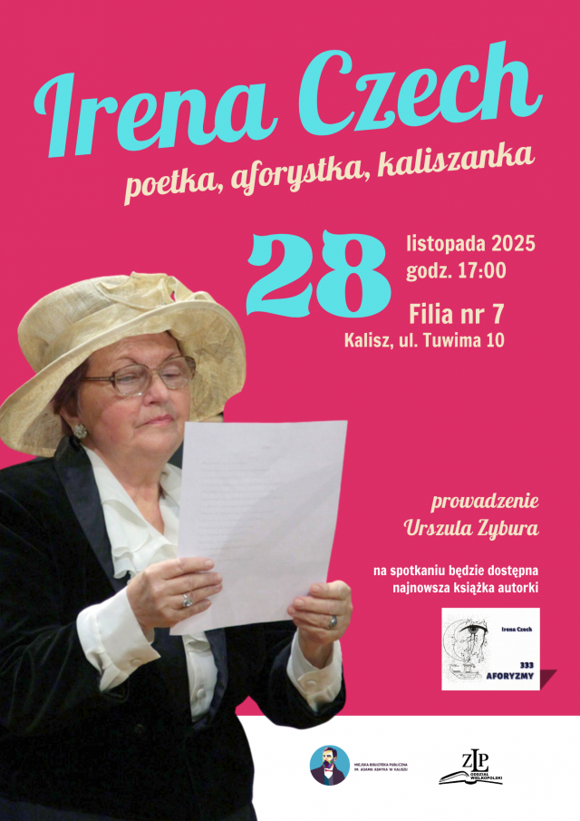 „Irena Czech jest kaliszanką, która od wielu, wielu lat pisze aforyzmy, fraszki i wiersze. Okazją do spotkania jest wydany niedawno tomik „333 aforyzmów” pani Ireny. Oprócz aforyzmów będziemy również czytać jej wiersze, rozmawiać o tym wszystkim, co wyda nam się ważne w ten późnolistopadowy wieczór, który poprowadzi dla państwa Urszula Zybura. Zapraszamy serdecznie” - a zapraszała słuchaczy radiaCENTRUM Izabela Fietkiewicz-Paszek z kaliskiej biblioteki.