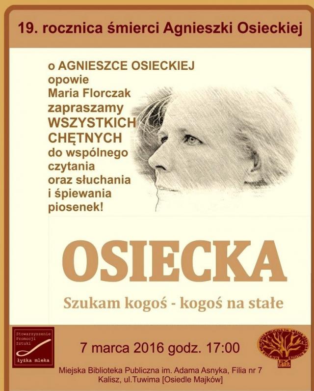 "To autorka ponad 2 000 różnych tekstów, z których większość na stałe zadomowiła się w historii polskiej muzyki rozrywkowej. O Osieckiej opowie Maria Florczak. Wszystkich zapraszamy do wspólnego czytania wierszy. A tym razem może też pośpiewamy: 'Małgośkę', 'Niech żyje bal' czy 'Okularników'" - powiedziała Radiu Centrum Beata Wicenciak z Łyżki Mleka.