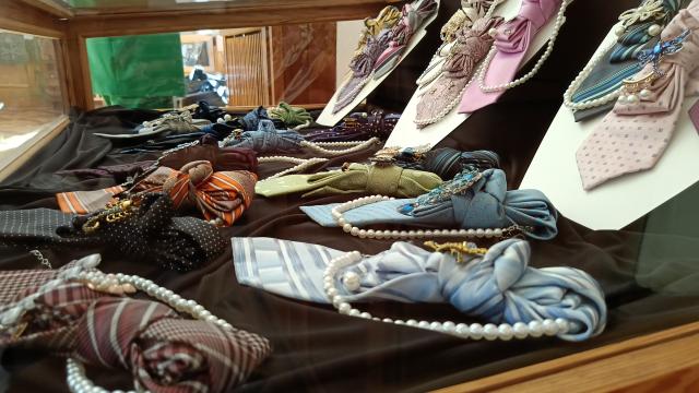 Natomiast w gablotach ustawionych także w holu na pierwszym piętrze siedziby władz powiatu kaliskiego można zobaczyć krawaty. Sylwia Pokojowczyk tworzy je z myślą o kobietach, więc obok fantazyjnego wiązania są też kamienie i perły.