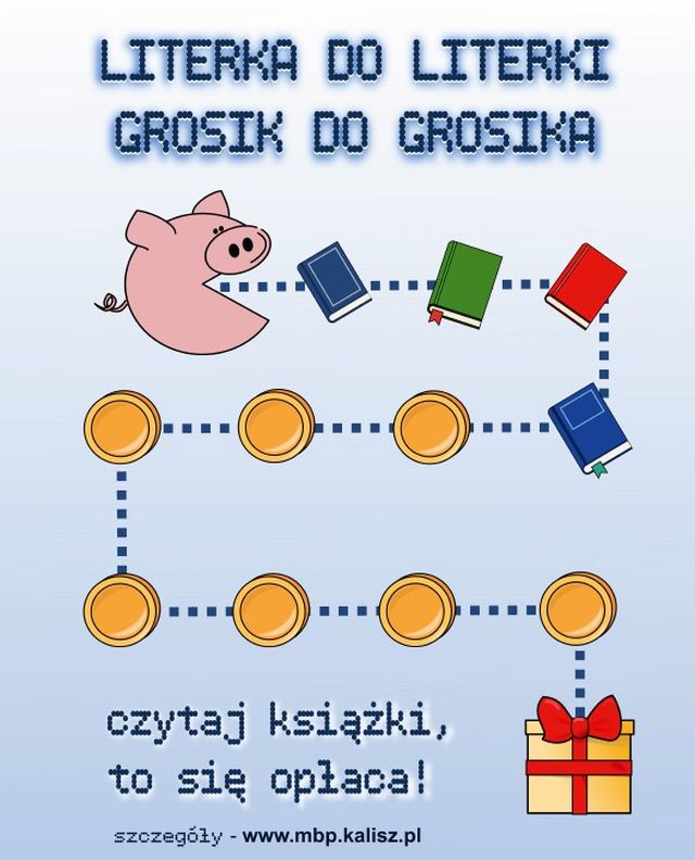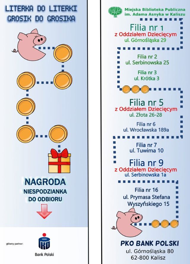 "Akcja "Literka do literki - grosik do grosika" jest skierowana do kaliskich przedszkolaków i uczniów klas 0-3 szkół podstawowych. Trwa do końca 2020 roku. Za wizyty w bibliotece i wypożyczanie książek uczestnicy akcji otrzymają naklejki, by następnie wypełnić nimi specjalne zakładki. Opłaca się być czytelnikiem Miejskiej Biblioteki Publicznej im. Adama Asnyka w Kaliszu, ponieważ za wypożyczanie książek i zebranie sześciu naklejek, na najmłodszych będzie czekać nagroda niespodzianka ufundowana przez PKO Bank Polski S.A., do odbioru w głównej siedzibie - przy ul. Górnośląskiej 80 w Kaliszu."
