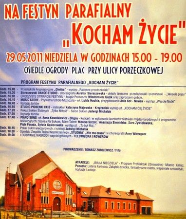 "Kocham życie" - pod takim hasłem w niedzielę odbędzie się festyn na kaliskim osiedlu Ogrody. Na jego małych i dorosłych uczestników czeka całe mnóstwo atrakcji, m.in. loteria fantowa, występy muzyczne, taneczne i teatralne, kącik dla dzieci i słodki poczęstunek. Miłą niespodzianką będzie też prowadzenie imprezy przez Tomasza Zubilewicza, znanego prezentera TVN-u. Impreza rozpocznie się na placu przy ul. Porzeczkowej o godz. 15:00. W tym samym miejscu i czasie prowadzona będzie akcja Biała Niedziela zorganizowana przez Miasto Kalisz. W jej ramach mieszkańcy osiedla Ogrody oraz wszyscy inni chętni, będą mogli bezpłatnie skorzystać z porad: internisty, laryngologa, kardiologa i pielęgniarki.