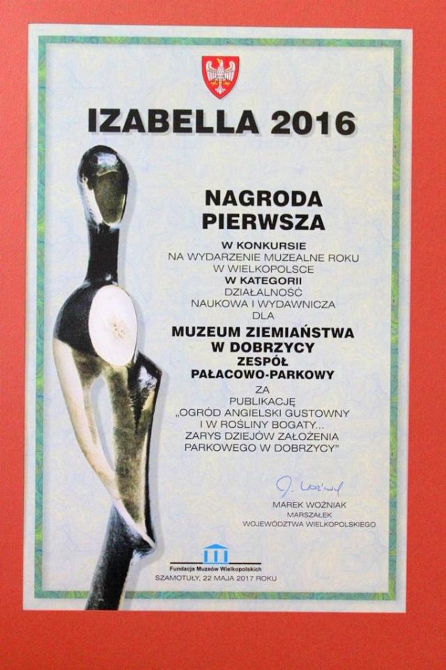 Muzeum Ziemiaństwa w Dobrzycy zdobyło Izabellę 2016 - nagrodę przyznawaną przez Marszałka Województwa Wielkopolskiego. Wyróżniona pierwszą nagrodą została publikacja Kazimierza Balcera "Ogród angielski gustowny i w rośliny bogaty... zarys dziejów założenia parkowego w Dobrzycy".
