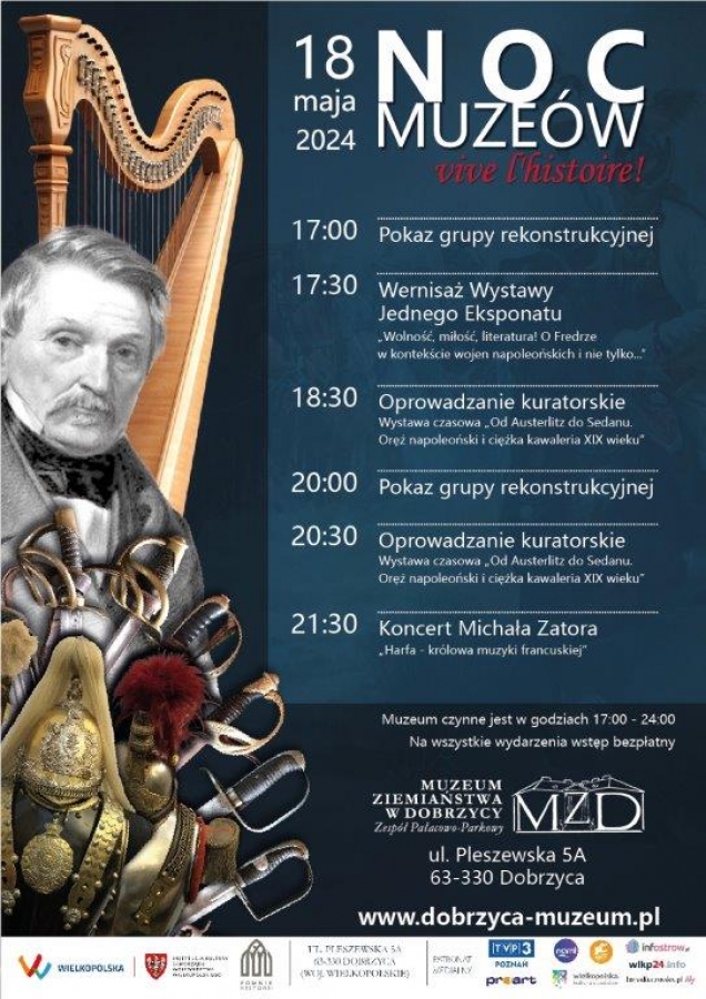 Oręż napoleoński i ciężka kawaleria XIX wieku’’- w świat bitew XIX wieku, w których uczestniczyli bracia Kazimierz i Adam Turno - mieszkańcy pałacu w Dobrzycy zabierze gości dr Stanisław Borowiak. Drugie oprowadzanie o 20.30. Na finał muzyka - o 21.30 w Sali Balowej koncert Michała Zatora - "Harfa - królowa muzyki francuskiej". W czasie Nocy Muzeów drzwi dobrzyckiego pałacu będą otwarte dla gości do północy - zaprasza dyrektor Wiesław Kaczmarek.