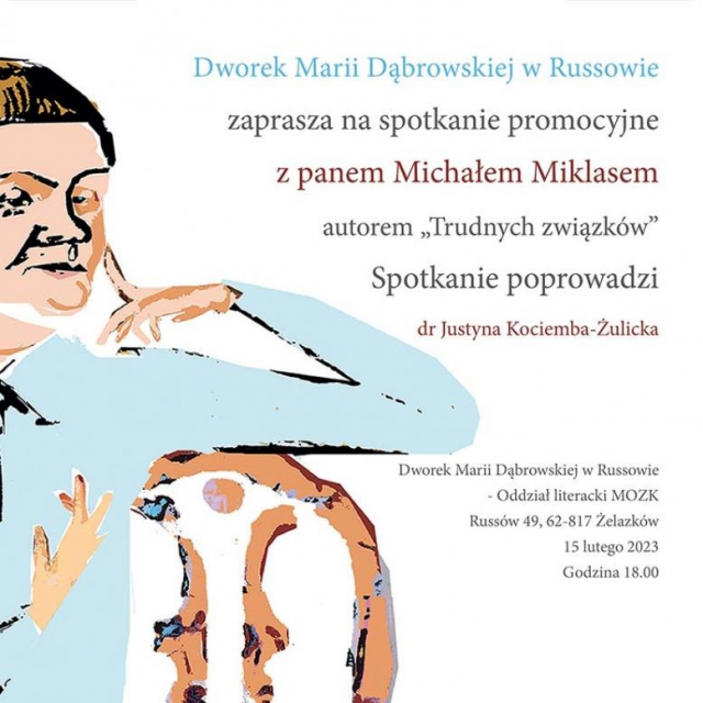 15 lutego w Dworku Marii Dąbrowskiej w Russowie odbędzie się spotkanie autorskie z Michałem Miklasem, autorem książki "Trudne związki". To opowieść o życiu Marii Dąbrowskiej i o jej relacjach, niekiedy bardzo burzliwych, z ukochanymi osobami. To także ważny komentarz do dzieł pisarki, które w tym kontekście jawią się jako próba zrozumienia przez nią własnego życia emocjonalnego. Przedstawiona w książce biografia Dąbrowskiej okazuje się zaskakująco nowoczesna. Publikacja rozwija wątki podjęte w wystawie o tym samym tytule, prezentowanej także w Dworku Marii Dąbrowskiej. Spotkanie z autorem o 18:00.