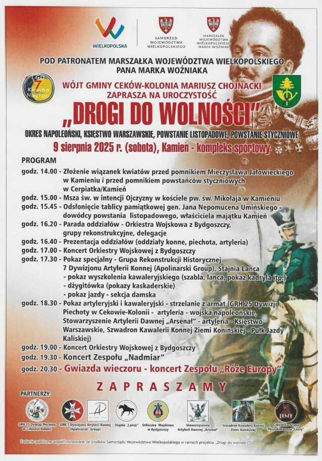 "Zapraszam do Kamienia na wielką inscenizację historyczną pod tytułem "Drogi do wolności" będziemy przypominać postać generała Jana Nepomucena Umińskiego, a także polski czyn zbrojny związany z Powstaniem Listopadowym czy epoką napoleońską. Mogę zdradzić, że widzowie będą świadkami pojedynku artyleryjskiego. Wieczorem muzycznie zakończymy ten dzień, gdyż odbędą się koncerty rockowe zespołów Nadmiar i Róże Europy".