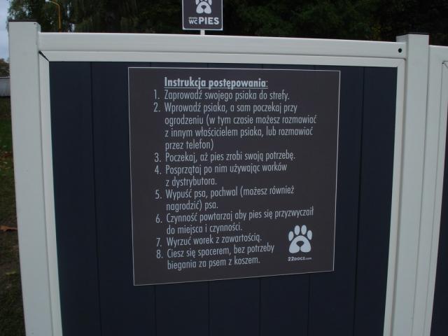 Strefa WC Pies jest pierwszym rozwiązaniem wprowadzonym w Krotoszynie. Konstrukcja wyposażona jest w elementy stymulujące potrzeby czworonogów, takie jak słupek czy murek, a nieduża wielkość strefy pozwala na umieszczanie jej na osiedlach czy przy placach zabaw. Zamknięta struktura ogranicza widoczność psa, dzięki czemu nie rozprasza się on np. widokiem innego zwierzaka, czy odbijającą się piłką. Strefa opatrzona jest dokładną instrukcją obsługi, która nakłada na właściciela psa pewne obowiązki - przede wszystkim sprzątanie po swoim pupilu.