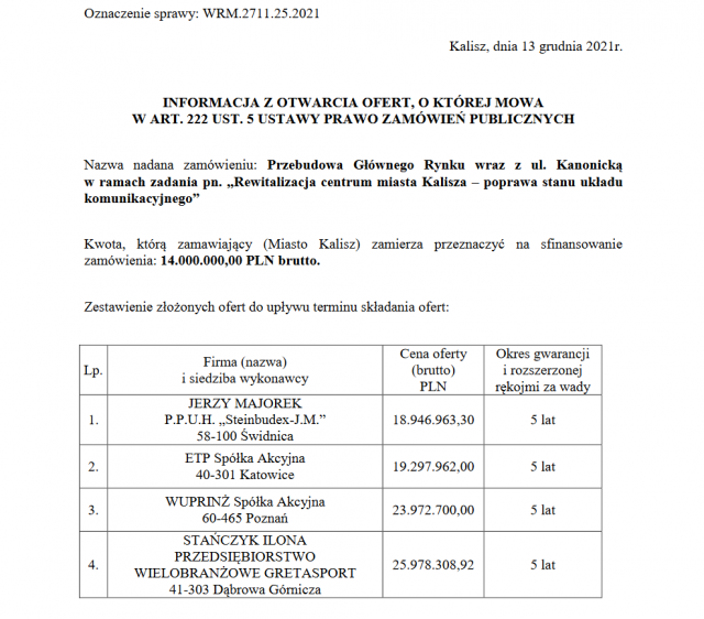 Włodarze do wyboru mają 4 oferty. Najdroższą zaproponowało przedsiębiorstwo z Dąbrowy Górniczej, które za remont kaliskiej starówki chce prawie 26 000 000 złotych; najtańszą - świdnickie przedsiębiorstwo. Miasto zamierza wydać na ten cel - 14 000 000 złotych. Zatem, jeżeli prace miałyby ruszyć na początku przyszłego roku, włodarze miasta musieliby zdecydować o zwiększeniu kwoty. Jeśli tak się stanie, wówczas wybrana firma będzie realizować projekt modernizacji Głównego Rynku i ul. Kanonickiej, oparty o zwycięską koncepcję pracowni wrocławskiego architekta, Romana Rutkowskiego.