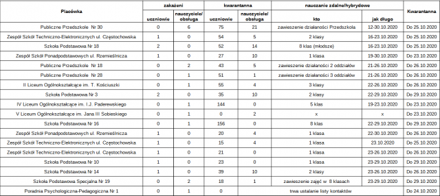 Do piątku zakażenie koronawirusem potwierdzono u 11 uczniów i 16 nauczycieli lub pracowników placówek edukacyjnych. Łącznie pozytywny wynik otrzymało 27 osób.