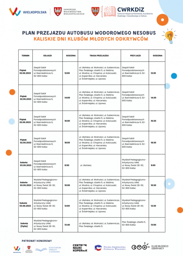 Rozkład jazdy zostanie opublikowany na stronie Centrum Wsparcia, Kształcenia Dualnego i Zawodowego w Kaliszu. Wszystkie atrakcje będą bezpłatne, a odbywać się będą w ramach święta miasta Kalisza. Partnerem wydarzenia jest marszałek województwa wielkopolskiego Marek Woźniak i wielkopolski Kurator Oświaty.