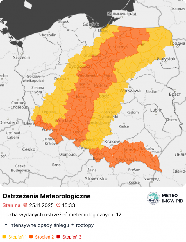 Instytut Meteorologii i Gospodarki Wodnej wydał dla Południowej Wielkopolski ostrzeżenie drugiego stopnia o intensywnych opadach śniegu. Zgodnie z przewidywaniami, padać zacznie w nocy z wtorku na środę.