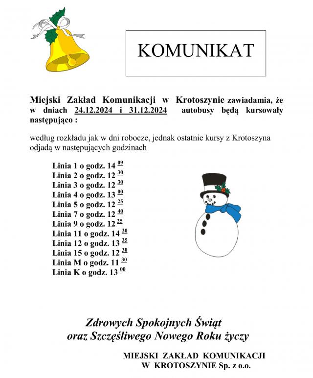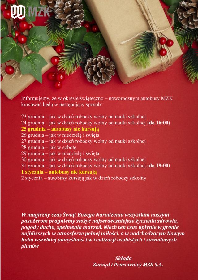 25 i 26 grudnia autobusy MZK Krotoszyn nie będą kursować. 27 grudnia autobusy pojadą jak w dni wakacyjne, Zmiany w kursowaniu przewidziane są na Wigilię i Sylwestra.