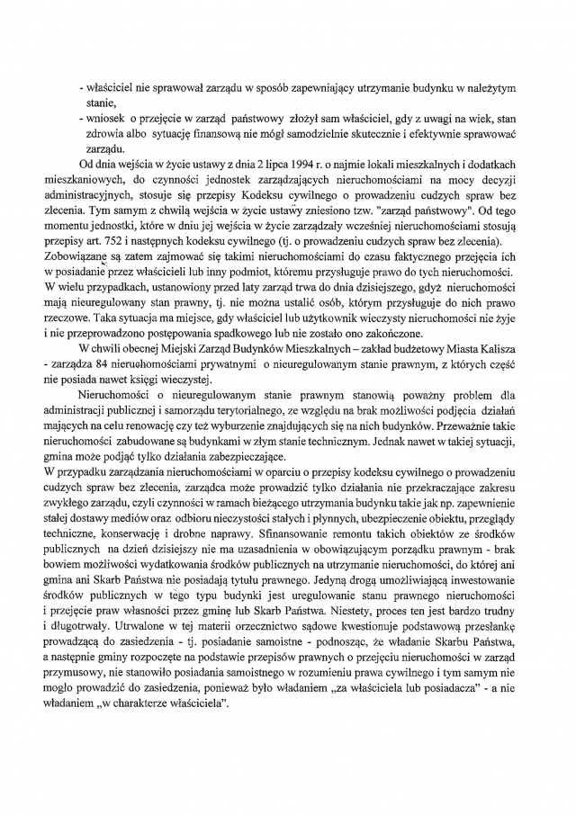 "Obecnie Miejski Zarząd Budynków Mieszkalnych - zakład budżetowy Miasta Kalisza- zarządza 84 nieruchomościami prywatnymi o nieregulowanym stanie prawnym, z których część nie posiada nawet księgi wieczystej. Nieruchomości o nieuregulowanym stanie prawnym stanowią bardzo poważny problem dla administracji publicznej i samorządu terytorialnego" - powiedział radiuCENTRUM Krystian Kinastowski, prezydent Kalisza i dodał, że bardzo często są one w bardzo złym stanie technicznym.