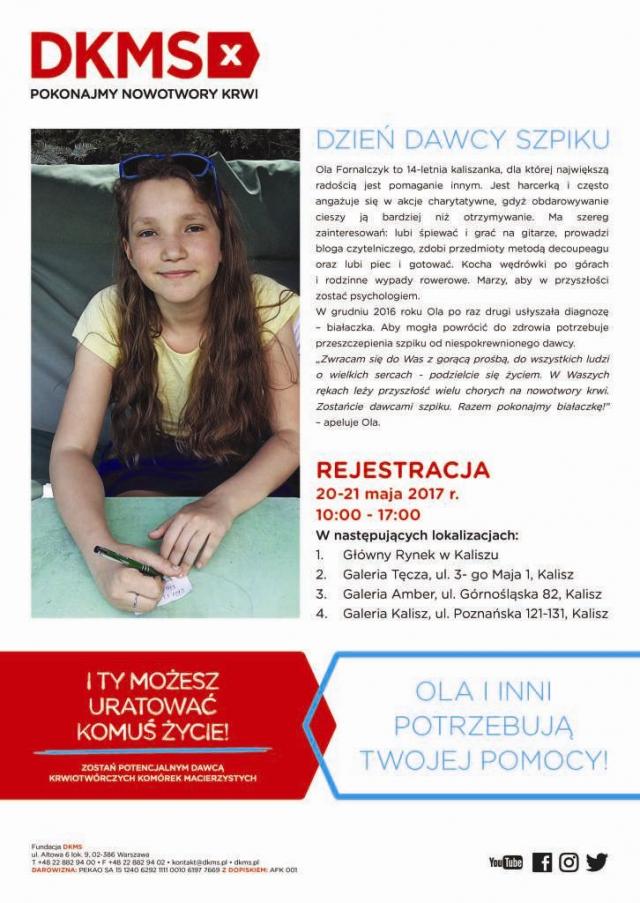 Ola i Justyna aby powrócić do zdrowia potrzebują przeszczepienia szpiku od niespokrewnionego dawcy. Niestety, pomimo zarejestrowanych w polskim rejestrze Poltransplantu ponad 1 200 000 potencjalnych dawców i ponad 29 000 000 w bazach na całym świecie - nie ma aktualnie dawcy, który byłby zgodny genetycznie z Olą i Justyną. Ich najbliżsi i przyjaciele nie potrafią czekać bezczynnie – sami zainicjowali poszukiwania jego bliźniaka genetycznego. Rejestracja potencjalnych dawców odbędzie się równocześnie w 4 lokalizacjach w Kaliszu: na Głównym Rynku oraz w trzech galeriach handlowych Amber, Tęcza oraz w galerii przy ul. Poznańskiej. Akcja odbędzie się w sobotę i niedzielę od 10:00 do 17:00.