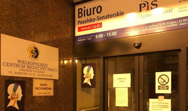 Jeszcze tego samego dnia wieczorem na drzwiach siedziby Prawa i Sprawiedliwości w Kaliszu przy ul. Zamkowej - w geście solidarności z protestującymi w Warszawie, ale przede wszystkim sprzeciwu - naklejono plakaty - Strajk Kobiet. Pod drzwiami pojawiły się też wieszaki, po które niegdyś zdesperowane i pozbawione praw kobiety sięgały, by przerwać ciążę. Często ze skutkiem śmiertelnym.