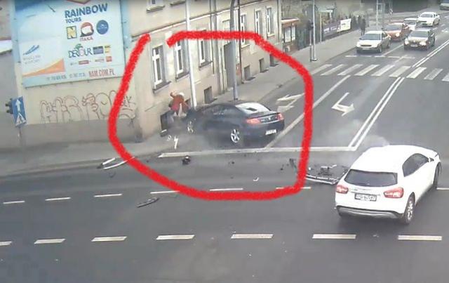 Opel wypadł z drogi, przewrócił się na bok i odbił się od stojącego na rogu ulic Kościuszki i Śródmiejskiej sygnalizatora świetlnego. Po chodniku w tym samym czasie poruszali się piesi, którzy rozbiegli się widząc zagrożenie. Na szczęście nikt z nich nie ucierpiał.