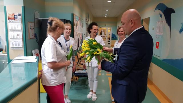 "To nie koniec, bo jeszcze panie pracują przecież na szpitalnej wieczorynce - i do nich też dotrzemy z kwiatami i życzeniami" - mówił w trakcie tulipanowej wędrówki szpitalnymi korytarzami Radosław Kołaciński, szef kaliskiej lecznicy.