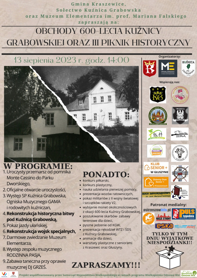 Początek uroczystości o godz. 13:45. W programie nie zabraknie atrakcji, na gości czekać będą m.in. rekonstrukcja historycznej bitwy pod Kuźnicą Grabowską czy wybijanie okolicznościowych monet z okazji 600-lecia Kuźnicy Grabowskiej. Chętni będą mogli również zwiedzić lokalne Muzeum Elementarza im. prof. Mariana Falskiego.