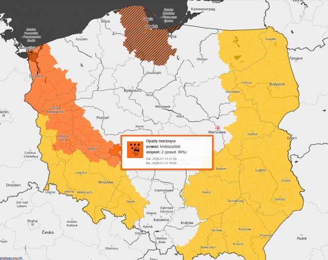 Niebezpiecznie będzie także w powiatach gostyńskim, grodziskim, kościańskim, leszczyńskim, Lesznie, międzychodzkim, nowotomyskim, rawickim i wolsztyńskim. Alert obowiązuje od godziny 1:00 we wtorek, 13 stycznia do godziny 16:00 we wtorek, 13 stycznia.