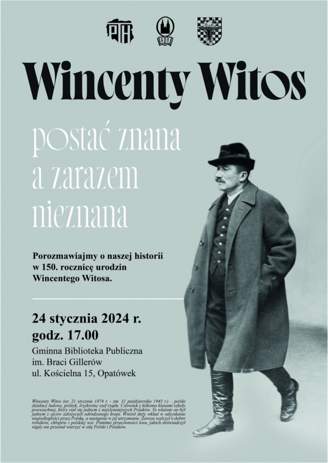 24 stycznia w Gminnej Bibliotece Publicznej im. Braci Gillerów w Opatówku odbędzie się spotkanie pod nazwą "Wincenty Witos-postać znana, z zarazem nieznana". Wydarzenie organizuje Powiat Kaliski, kaliski oddział Polskiego Towarzystwa Historycznego oraz biblioteka w Opatówku.