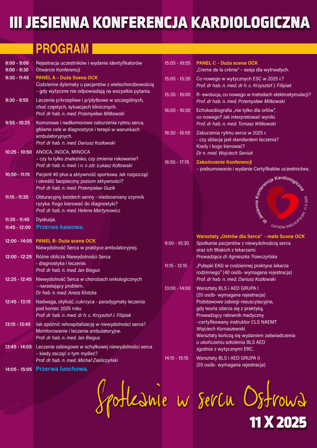 Dodatkowo odbędą się warsztaty z EKG oraz RKO prowadzone przez profesora Dariusza Kozłowskiego. Aby wziąć udział w konferencji, trzeba się na nią zapisać. Można to zrobić telefonicznie pod numerem Delegatury Wielkopolskiej Izby Lekarskiej w Ostrowie Wielkopolskim lub na stronie wydarzenia - konferencjakardiologiczna.pl.