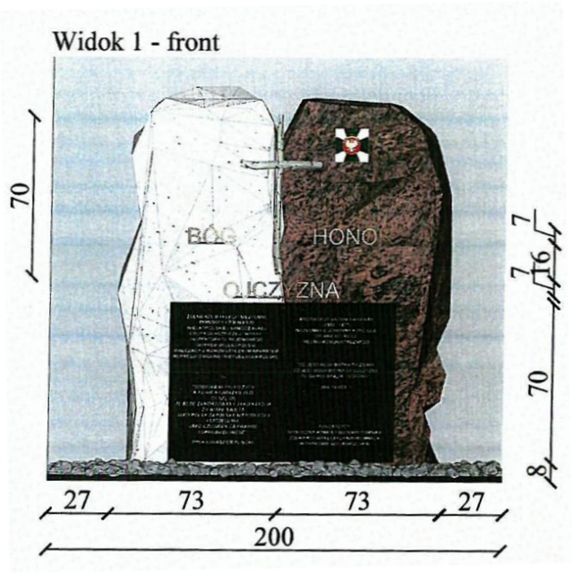 Na stronie czołowej widnieć będzie napis: BÓG, HONOR I OJCZYZNA, a w przestrzeni między kamiennymi obeliskami będzie znajdować się symboliczny, brzozowy krzyż przeniesiony z mogiły żołnierzy kpt. „Błyska” z Odolanowa – słynnego żołnierza podziemia antykomunistycznego z czasów bezpośrednio po II Wojnie Światowej.
