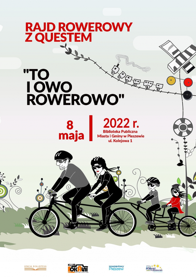 Biblioteka Publiczna Miasta i Gminy w Pleszewie zaprasza w najbliższą niedzielę na rajd rowerowy z cyklu "Odjazdowy bibliotekarz". Tytuł rajdu "To i owo rowerowo". Start spod biblioteki na dawnym dworcu kolejowym, meta w wigwamach przy stadionie.