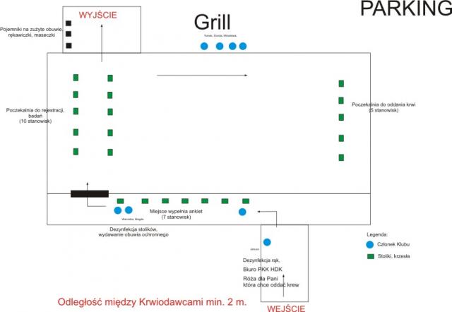 Do dużej sali Domu Parafialnego krwiodawca wchodzi w maseczce, dezynfekuje ręce i wypisuje kwestionariusz długopisem, który potem zabiera ze sobą. Dzieci, które będą towarzyszyć rodzicom - krwiodawcom, do sali nie wejdą. Będą mogły czekać przy grillu, na który jest zaproszony każdy krwiodawca po oddaniu krwi. Zarządowi Klubu udało się zdobyć kiełbasę i mięso na grilla, pomidory i ogórki, za które dziękuje sponsorom.