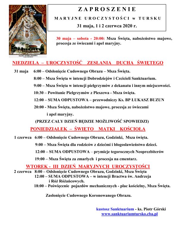 Kult MB Łaskawej w Tursku trwa nadal. Także w tym roku nowy proboszcz, ks. Piotr Górski zaprasza na trzydniową modlitwę do pięknego i malowniczo położonego Turska.