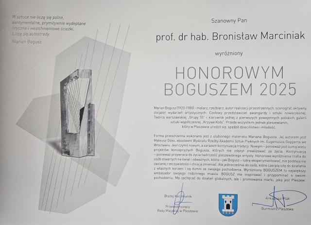 Statuetkę ustanowiono z okazji 740-lecia Pleszewa jako sposób na docenienie osób, które, jak urodzony w Pleszewie artysta Marian Bogusz, potrafiły zmieniać rzeczywistość i były dumne ze swojego pochodzenia. Taki właśnie jest prof. Bronisław Marciniak, naukowiec, rektor UAM dwóch kadencji. Dzięki jego staraniom w rodzinnym mieście przez 8 lat funkcjonował zamiejscowy ośrodek UAM, a 15 lat temu utworzono Pleszewski Uniwersytet Trzeciego Wieku. W 2016 roku przyznano prof. Marciniakowi tytuł Honorowego Obywatela Miasta Pleszewa. Teraz otrzymuje statuetkę Honorowego Bogusza nie tylko za dorobek naukowy ale też za przywiązanie do pleszewskich korzeni. Profesor Marciniak to prawdziwy ambasador Pleszewa, który swoją pracą i pasją przynosi mu chlubę i rozgłos - podkreśla burmistrz Pleszewa dr hab. Arkadiusz Ptak. Pierwszą statuetkę Honorowego Bogusza w 2023 roku otrzymała pleszewianka – była premier RP, prof. Hanna Suchocka.