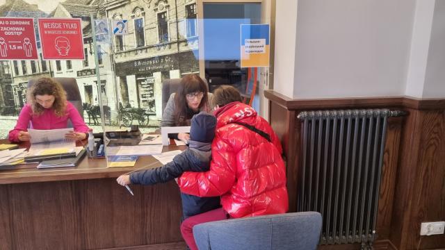 Katerinę można spotkać w siedzibie Straży Miejskiej, gdzie komendant Zbigniew Duszczak rejestruje uchodźców i udziela pierwszych informacji a potem pomaga w szukaniu mieszkań, załatwianiu tego, co do życia niezbędne. Katerina mu pomaga ale też przywozi swoich rodaków z miejscowości, do których pociągami dojeżdżają oni do Polski z Ukrainy. Oksana od dwóch dni pracuje w biurze podawczym Urzędu Miasta i Gminy w Pleszewie, gdzie pomaga swoim rodakom - wyłącznie tym, którzy opuścili Ukrainę po 24 lutego i mają status uchodźców, wypełnić formularze niezbędne do uzyskania numeru PESEL. Ten z kolei uprawnia ich do korzystania z opieki zdrowotnej, zapisu dziecka do szkoły, korzystania z świadczeń m.in. 500+ i 300 zł. W Pleszewie nadawanie numeru PESEL usprawniono, wystarczy wypełniony w języku polskim wniosek, do którego dołącza się scan ukraińskich dokumentów. Do tej pory PESEL otrzymało w Pleszewie ponad 20 osób, zaś do tej pory w mieście i gminie Pleszew zarejestrowano prawie 380 uchodźców. I wszyscy oni do ratusza przyjdą. Aby ułatwić robienie zdjęć niezbędnych do dokumentu, miasto uruchamia w sali ślubów pracownię fotograficzną.