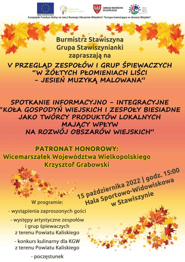 "Pragnę bardzo serdecznie zaprosić wraz z grupą Stawiszynianki oraz kołami gospodyń wiejskich z terenu gminy i maist Stawiszyn na spotkanie informacyjno-integracyjne pt. "Koła gospodyń wiejskich i zespoły biesiadne jako twórcy produktów lokalnych mających wpływ na rozwój obszarów wiejskich". Na tym spotkaniu odbędzie się również V Przegląd Zespołów i Grup Śpiewawczych pod tytułem " W żółtych płomieniach liści-jesień muzyką malowana". A w programie mamy m.in. występy artystyczne zespołów z terenu naszego miasta i gminy. Ponadto odbędzie się konkurs kulinarny dla kół gospoduń wiejskich z naszego obszaru jak i z terenu powiatu kaliskiego"-powiedział radiuCENTRUM Grzegorz Kaczmarek, burmistrz miasta i gminy Stawiszyn.