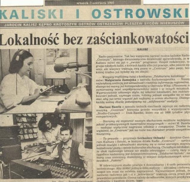 Zaczęło się całe 20 lat temu. Swój pierwszy program Radio Centrum nadało 12 marca 1992 roku na częstotliwości 97 MHz o godzinie 15:52. Emisję rozpoczęto utworem Phila Collinsa "Something Happend On The Way To Heaven", a program trwał 3 godziny i 53 minuty. Stacja powstałą z inicjatywy małej grupki zapaleńców i ówczesnego dyrektora Centrum Kultury i Sztuki w Kaliszu - Lechosława Ochockiego. Od tamtego dnia przez stację, jako jej pracownicy lub współpracownicy, przewinęło się ponad 200 osób. Obecnie Radiem Centrum kieruje Piotr Krysiak, pracujący w nim od roku 1992, kolejno jako serwisant, copywriter, reporter, szef agencji reklamowej i w końcu redaktor naczelny stacji. Prócz niego, nieprzerwanie od roku 1992 pracują w Radiu Centrum: Ewa Adamczak (biuro reklamy) i Mariusz Bazela (szef muzyczny) - radiowiec o najdłuższym stażu w stacji).