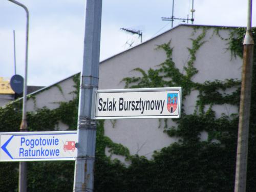 Wjeżdżamy od strony ul. Łódzkiej w Bursztynową - na znaku widnieje napis, że to Trasa. Więc jedziemy tą trasą - podziwiając widoki i dojeżdżając do Częstochowskiej ni z tego ni z owego, nagle znajdujemy się na Szlaku. Taki znak widnieje u wylotu z Bursztynowej. Więc trasa to czy szlak? Chyba jednak szlak, bo w zaroślach zauważamy kolejny znak z nazwą ulicy. Trzeba odsunąć gałęzie, żeby odczytać, co jest na nim napisane. Odsuwamy. A tam? A niech to szlag...! Szlak! Szlak Bursztynowy.