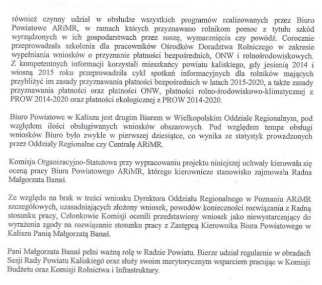 Barański podczas swojego wystąpienia podkreślał także, że kaliskie biuro ARiMR jest drugim w Wielkopolsce oddziałem regionalnym pod względem obsługiwanych wniosków obszarowych. Jeśli chodzi o tempo obsługi tych dokumentów, biuro zajmowało pierwsze miejsce, nigdy nie znalazło się poza dziesiątką. Radni, ze względu na „brak w treści wniosku dyrektora oddziału regionalnego ARiMR w Poznaniu szczegółowych powodów konieczności rozwiązania z radną stosunku pracy” uznali ten wniosek jako niewystarczający i zgody na zwolnienie koleżanki nie dali.
