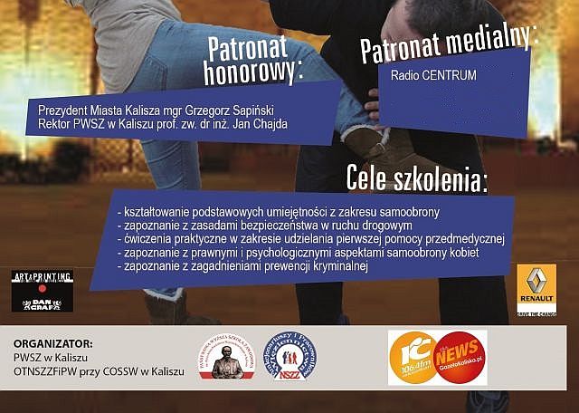 Jak informuje Radio Centrum współorganizator zajęć ppłk Mirosław Kuświk to także okazja do zdobycia niezbędnej wiedzy z zakresu przepisów dotyczących obrony koniecznej, czy też zasad ruchu drogowego. To wreszcie propozycja dla kobiet, które chcą poprawić swoją kondycję fizyczną. W poprzednich edycjach kursu brało udział około 150 kobiet. Tegoroczne zajęcia rozpoczną się 11 maja w sali sportowej uczelni PWSZ przy Nowym Świecie o godzinie 18:00. W sumie zaplanowano cztery spotkania do 8 czerwca, łącznie 16 godzin zajęć. Na zakończenie uczestniczki otrzymają specjalne certyfikaty potwierdzające udział w kursie. Panie uczestniczące w zajęciach powinny zabrać ze sobą strój sportowy i posiadać aktualne badania lekarskie.