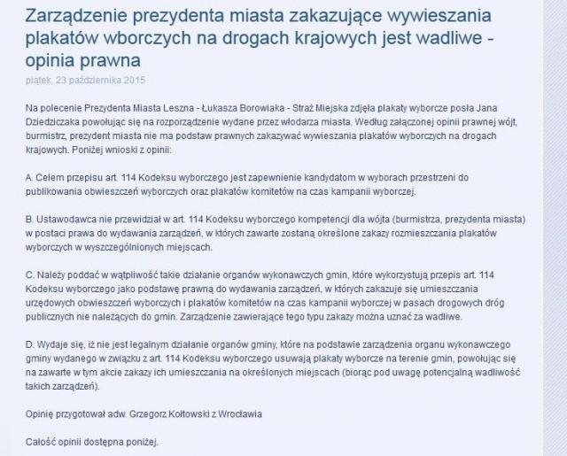 Natomiast ekspertyza prawna przeprowadzona na potrzeby kandydata na posła, a obecnie znów posła Dziedziczaka – dotycząca Leszna, a przeniesiona analogią sytuacji na Kalisz - wisi już na jego stronie internetowej. Użyty tam język to między innymi stwierdzenia: „Wydaje się, iż nie jest legalnym…” czy „Należy poddać w wątpliwość takie działanie organów wykonawczych gmin…”