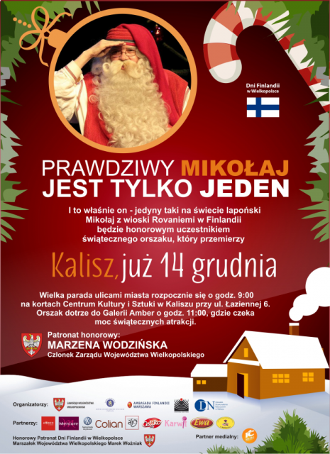 Jest tylko jeden, ma ponad 1000 lat i jak na swój wiek całkiem nieźle się trzyma. Święty Mikołaj, prawdziwy bo z Laponii, 14 grudnia odwiedzi Kalisz. Wizyta będzie kulminacyjnym punktem odbywających się w grudniu w Wielkopolsce Dni Finlandii. Mikołaj pojawi się w Kaliszu na wniosek marszałek Marzeny Wodzińskiej, członka zarządu woj. wielkopolskiego, która w rozmowie z Radiem Centrum przyznała, że w organizację tego wyjątkowego spotkania włączyło się wiele osób związanych z kaliską oświatą.