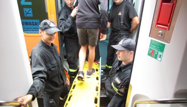 Pasażerom pociągu strażacy pomagali się przesiadać do zastępczego składu.