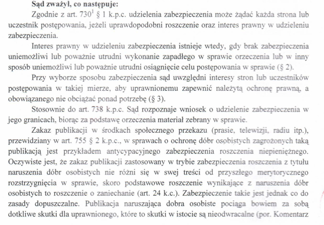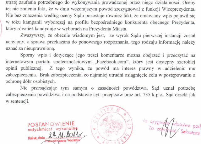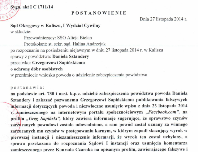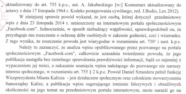 "Sąd postanowił udzielić zabezpieczenia powództwa powoda Daniela Sztandery i zakazać pozwanemu, Grzegorzowi Sapińskiemu, publikowania fałszywych, powtarzam - fałszywych, informacji dotyczących powoda i niezwłocznie usunąć wpisy. Sąd w tym momencie, już na podstawie zebranego materiału stwierdził, że te wpisy pana Grzegorza Sapińskiego były fałszywe. "Nie bez znaczenia jest" - i to są słowa sądu: "nie bez znaczenia według oceny sądu pozostaje również fakt, że omawiany wpis pojawił się w toku kampanii wyborczej na profilu bezpośredniego konkurenta obecnego prezydenta, który również kandyduje w wyborach na prezydenta miasta." Czyli sąd ocenia, że te wpisy mają wpływ na kampanię wyborczą."