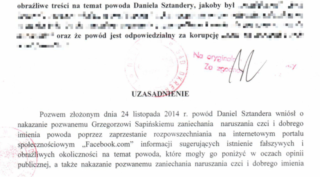 Wpisy objęte postępowaniem pojawiły się na internetowym profilu Sapińskiego i naruszały dobre imię Sztandery. Ten zaś oddał sprawę do sądu.