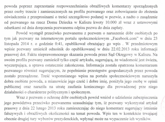 Obecnie w kaliskich sądach toczą się jeszcze 2 postępowania przeciwko G.Sapińskiemu, związane z zarzutami naruszenia przez niego dóbr osobistych innych kaliszan. Jedno postępowanie toczy się z wniosku tego kandydata.