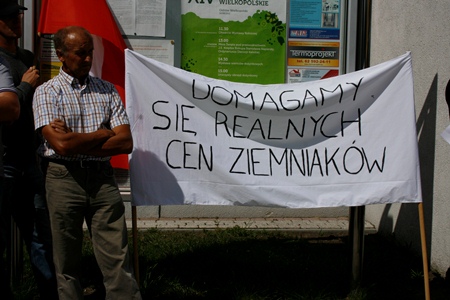 Wbrew wcześniejszym pogłoskom nie rzucali ziemniakami, ale rozdawali je mieszkańcom. Do ich rąk trafiały worki wypełnione bulwami wraz z ulotką o cenach i marżach, jakie płacą klienci. Kilkudziesięciu rolników protestowało w poniedziałek przed ostrowskim starostwem przeciwko "lichwiarskim cenom i niesprawiedliwym przepisom unijnym". Handlowe marże pośredników przekraczają dziś wg protestujących nawet 1000 procent. Jeśli producenci ziemniaków otrzymują za kilogram 9 groszy, to dla klienta cena waha się od 60 groszy do 1,50 zł. Jednak dla rolników zabójcze wydają się nie tylko ceny, ale też badania fitosanitarne.