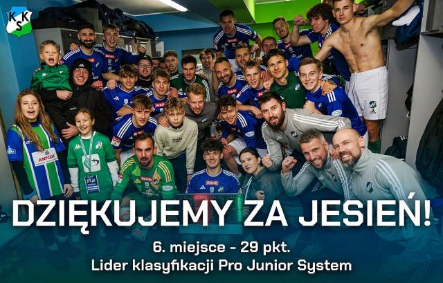 Po udanym listopadzie i serii czterech meczów bez porażki piłkarze KKS-u zakończyli jesień w strefie barażowej. W 19 rozegranych meczach "trójkolorowi" uzbierali 29 punktów, co dało im szóste miejsce w tabeli Betlic II ligi. Trener KKS-u Kalisz Marcin Woźniak podkreśla radiuCENTRUM że jego drużyna prowadzi w klasyfikacji pro system junior, czyli występach najmłodszych piłkarzy i to oni na wiosnę mogą stanowić o sile zespołu: