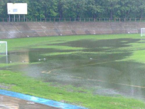 Obydwa kaliskie boiska są zalane, niestety na Calisii nikt nie pomyślał, by zablokować studzienki kanalizacji deszczowej i woda swobodnie wybija od wczoraj. Jak ktoś ma ochotę to może pograć w wodnego tenisa...