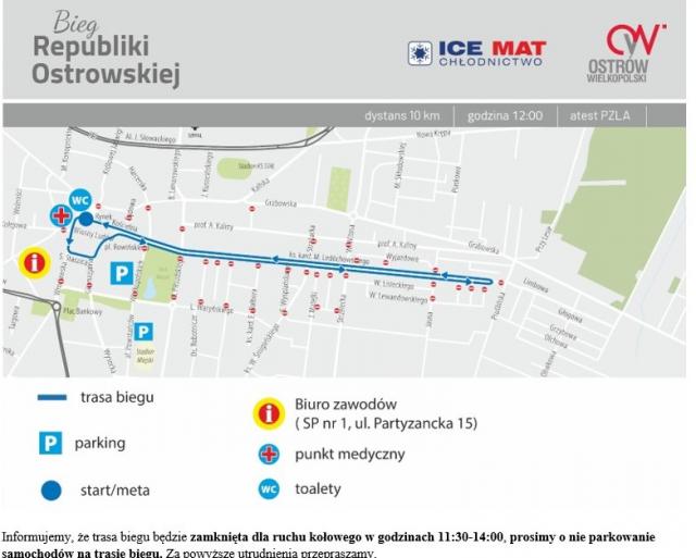 W niedzielę odbędzie się 62.Bieg Republiki Ostrowskiej. W trakcie trwania imprezy od 11:30 do 14:00 wystąpią utrudnienia w ruchu w centrum Ostrowa na trasie biegu głównego.