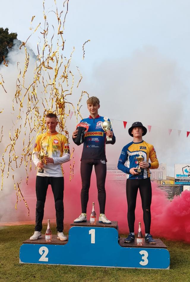 na fot.: Paweł Szkudlarek na najwyższym stopniu podium Indywidualnych Mistrzostw Polski Juniorów w Speedrowerze.